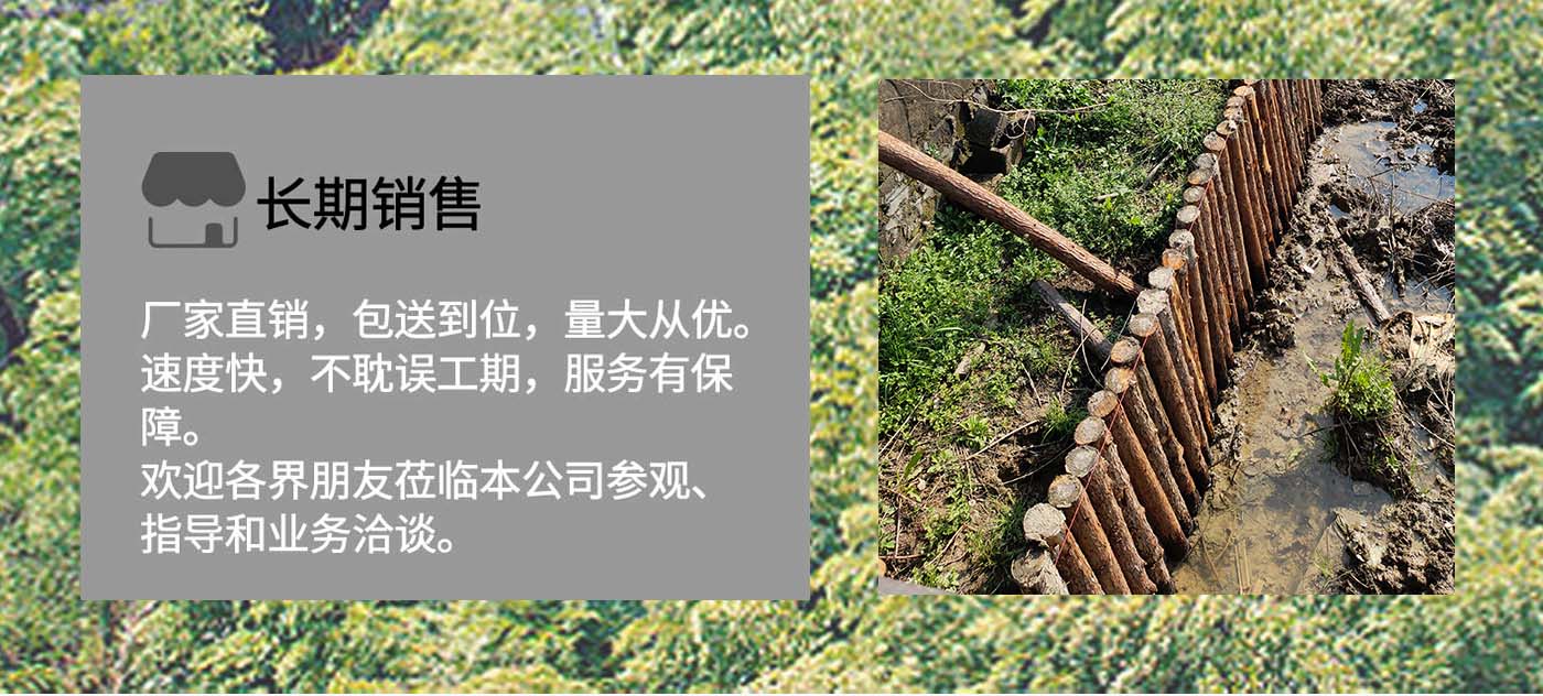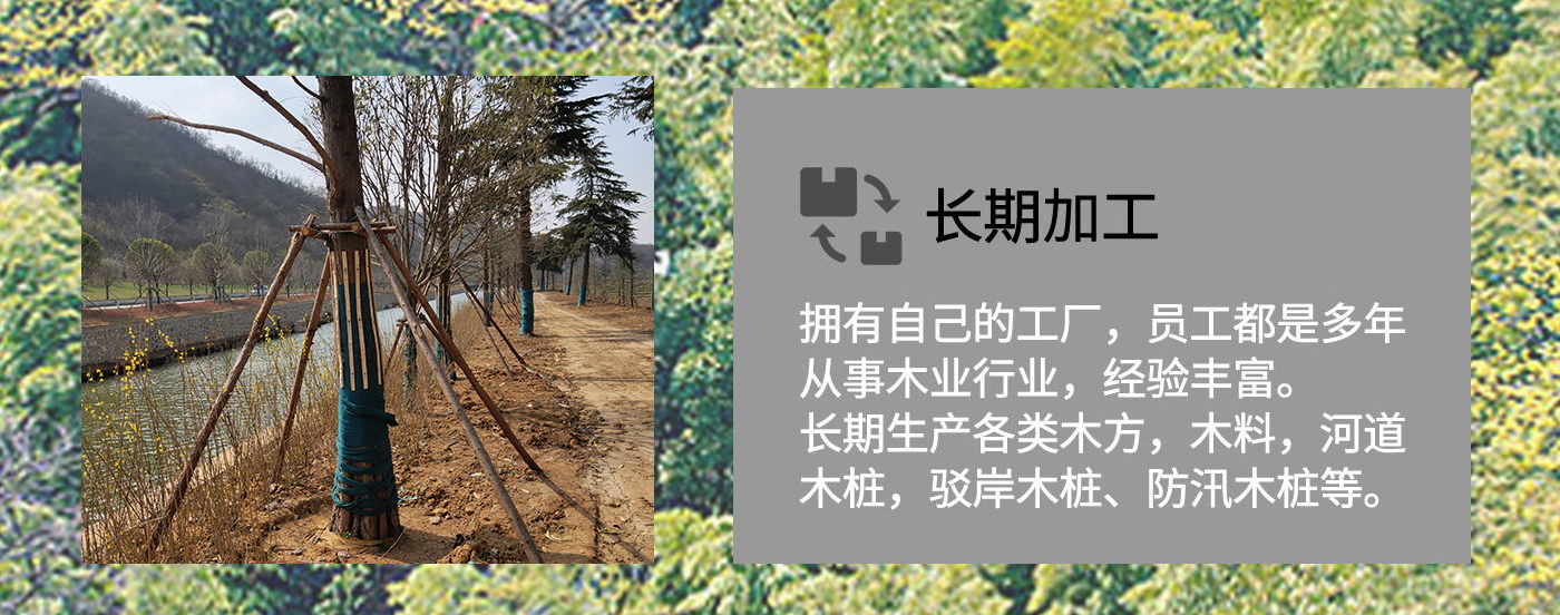 南京市云森木業(yè)有限公司位于南京市高淳區(qū)。是一家生產加工,線上銷售為一體的現(xiàn)代化企業(yè)。擁有完善、科學的質量管理體系及工作團隊。 公司主營松木樁,杉木樁,打樁木,河道木樁,駁岸木樁,防汛木樁,景觀木樁、園林綠化支撐桿等,也可支持方料,木板等木材定制加工產品,所選原材料均為黃山中心林區(qū),樹齡均在三十年左右。質地緊密,樹形優(yōu)美。 本公司貨源充足,供貨能力強,地處高淳,交通方便利,江浙滬皖送貨上門,當天可達。本著“誠信為本,客戶至上”的經營宗旨,真誠希望與您合作。 歡迎各位客戶前來咨詢,定以優(yōu)良品質和價格回饋廣大客戶。